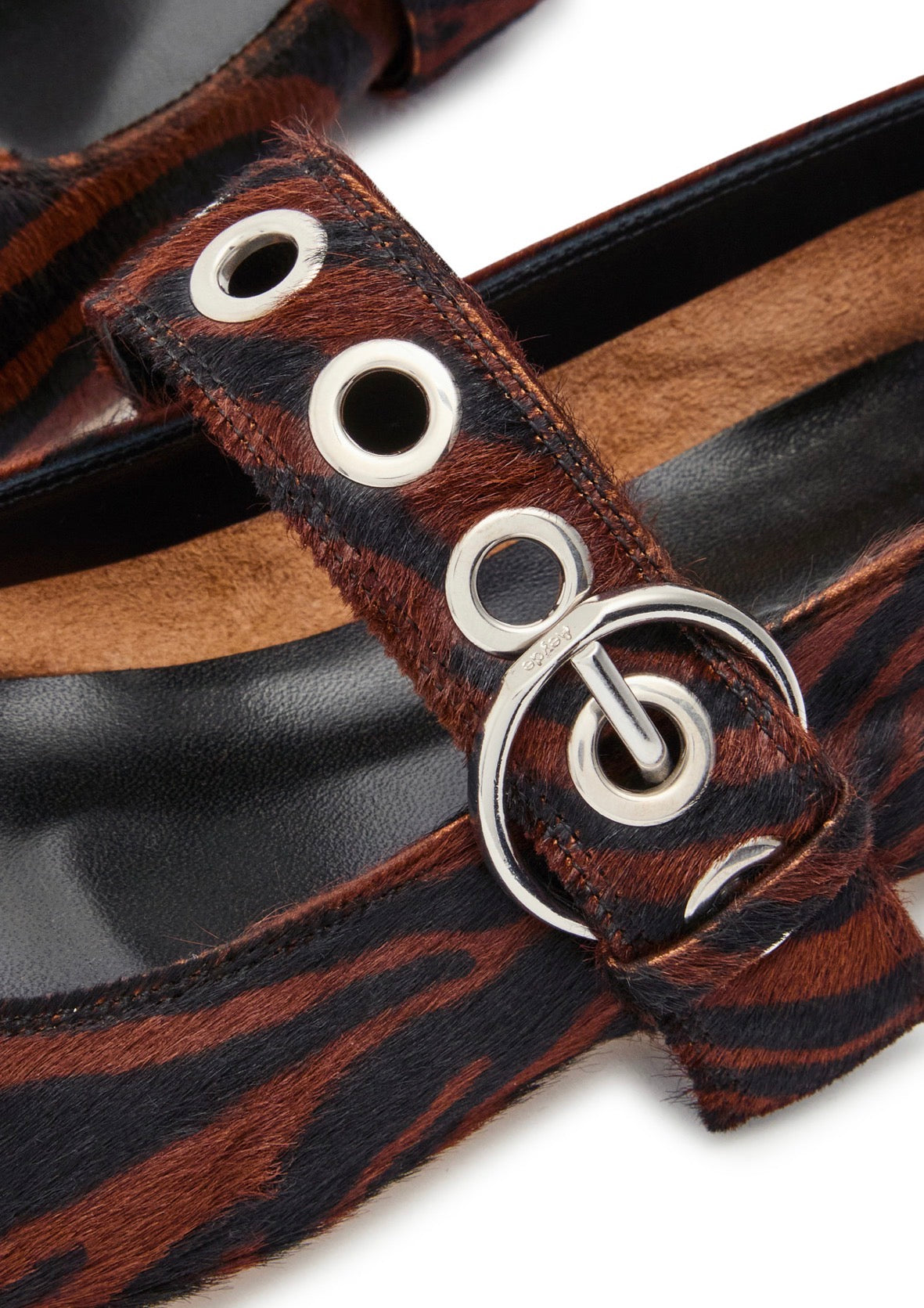 Aeyde „Mary Jane“ tipo bateliai iš veršelio kailio – išskirtinis klasikinio silueto ir modernių detalių derinys. Zebra rašto efektas suteikia modeliui drąsų, madingą akcentą, o kvadratinė noselė išlaiko šiuolaikišką ir architektūrišką formą.