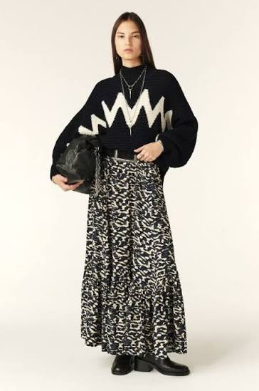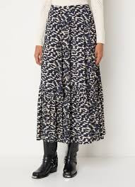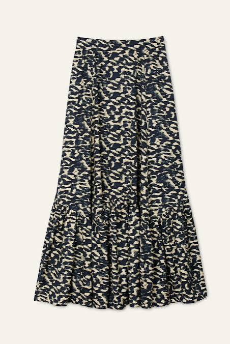 Ilgas, maxi ilgio sijonas su sluoksniuotu dizainu ir abstrakčiu raštu. Lengvai krintantis audinys suteikia judesio ir laisvumo, o paslėptas šoninis užtrauktukas išlaiko švarią silueto liniją. Sukurtas patogiam, laisvam dėvėjimui – puikiai tiks tiek kasdieniams, tiek bohemiškiems deriniams.