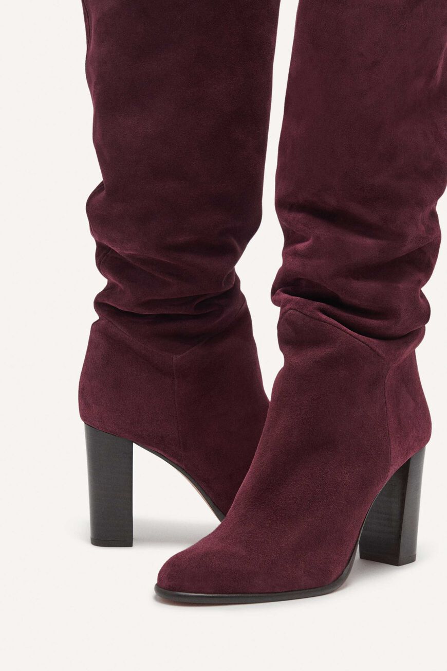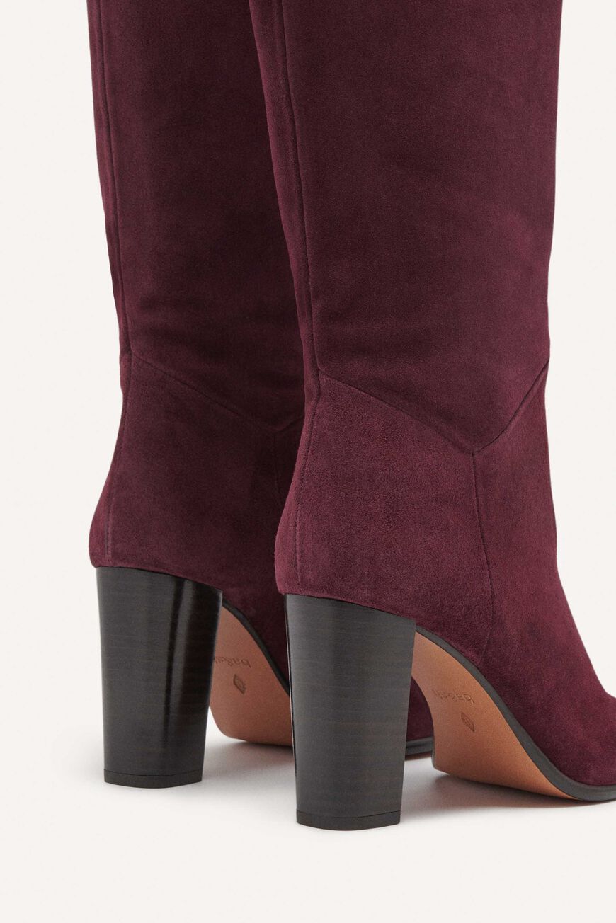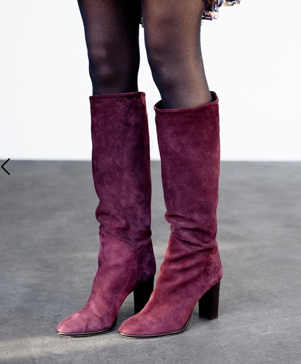 Bordo spalvos zomšiniai ilgaauliai – išraiškingas ir elegantiškas modelis, skirtas tapti pagrindiniu sezono akcentu. Švelniai smailėjantis priekis ir stabilus, masyvesnis kulnas sukuria moterišką, bet patogų siluetą, tinkantį tiek kasdieniams, tiek ypatingiems deriniams.