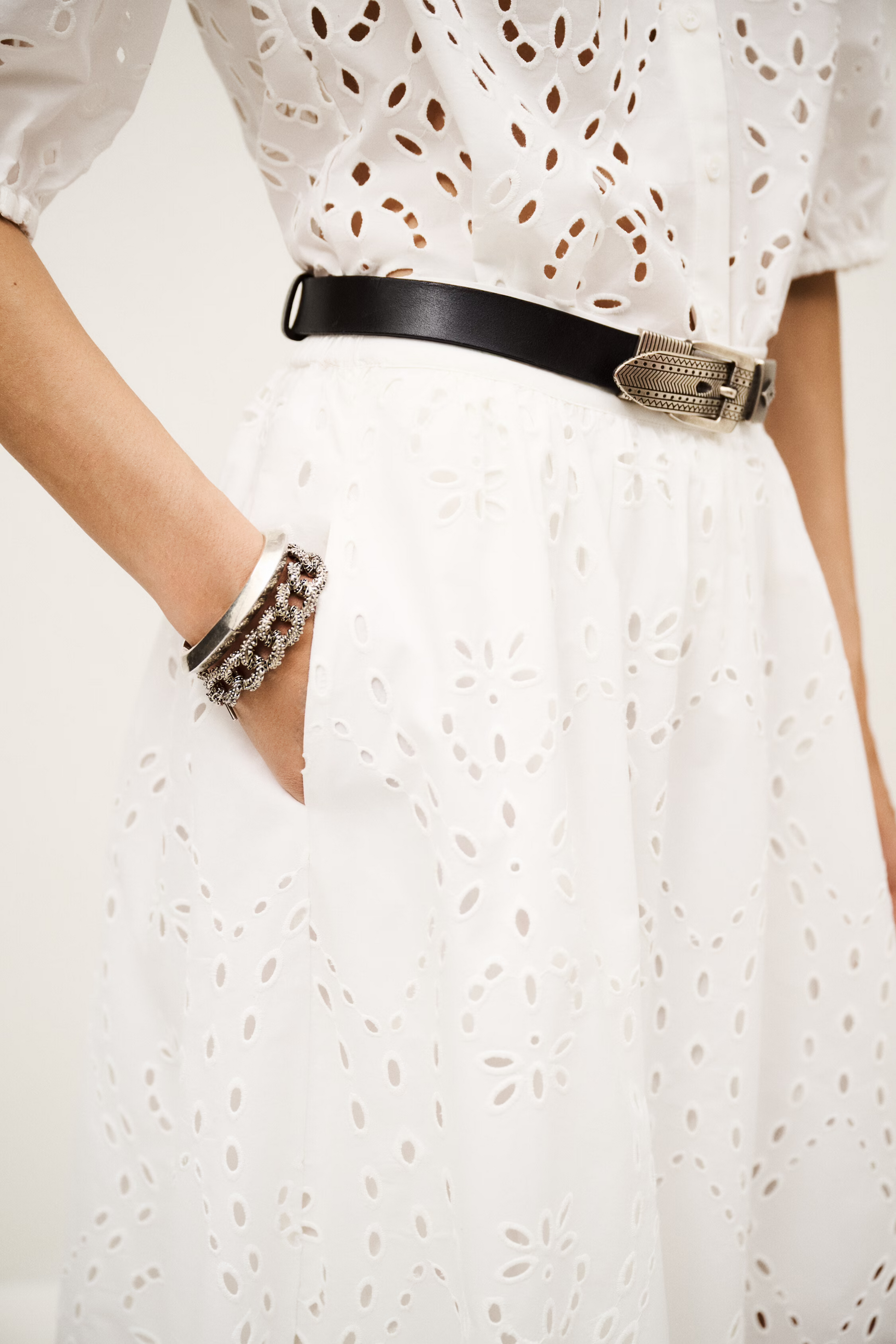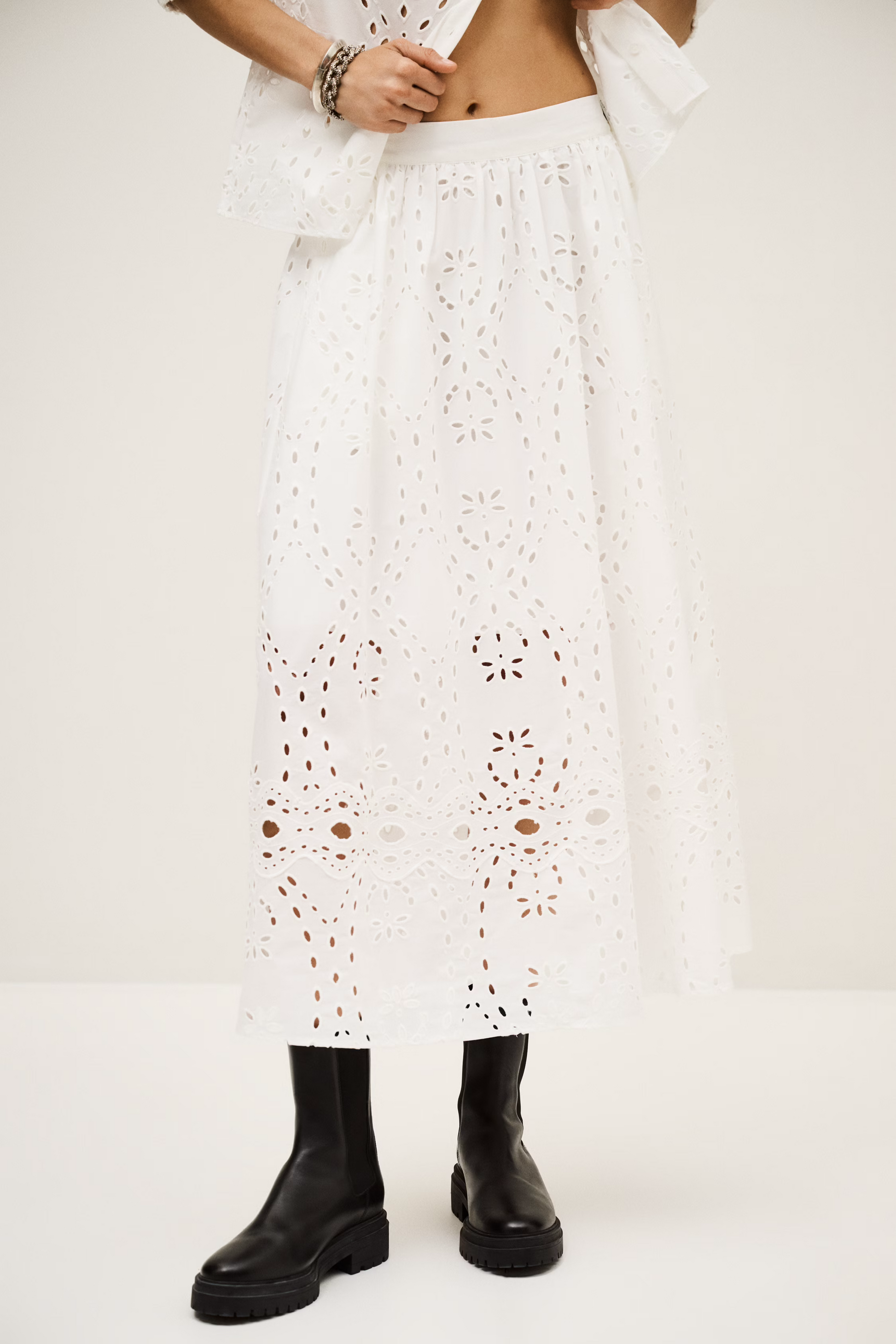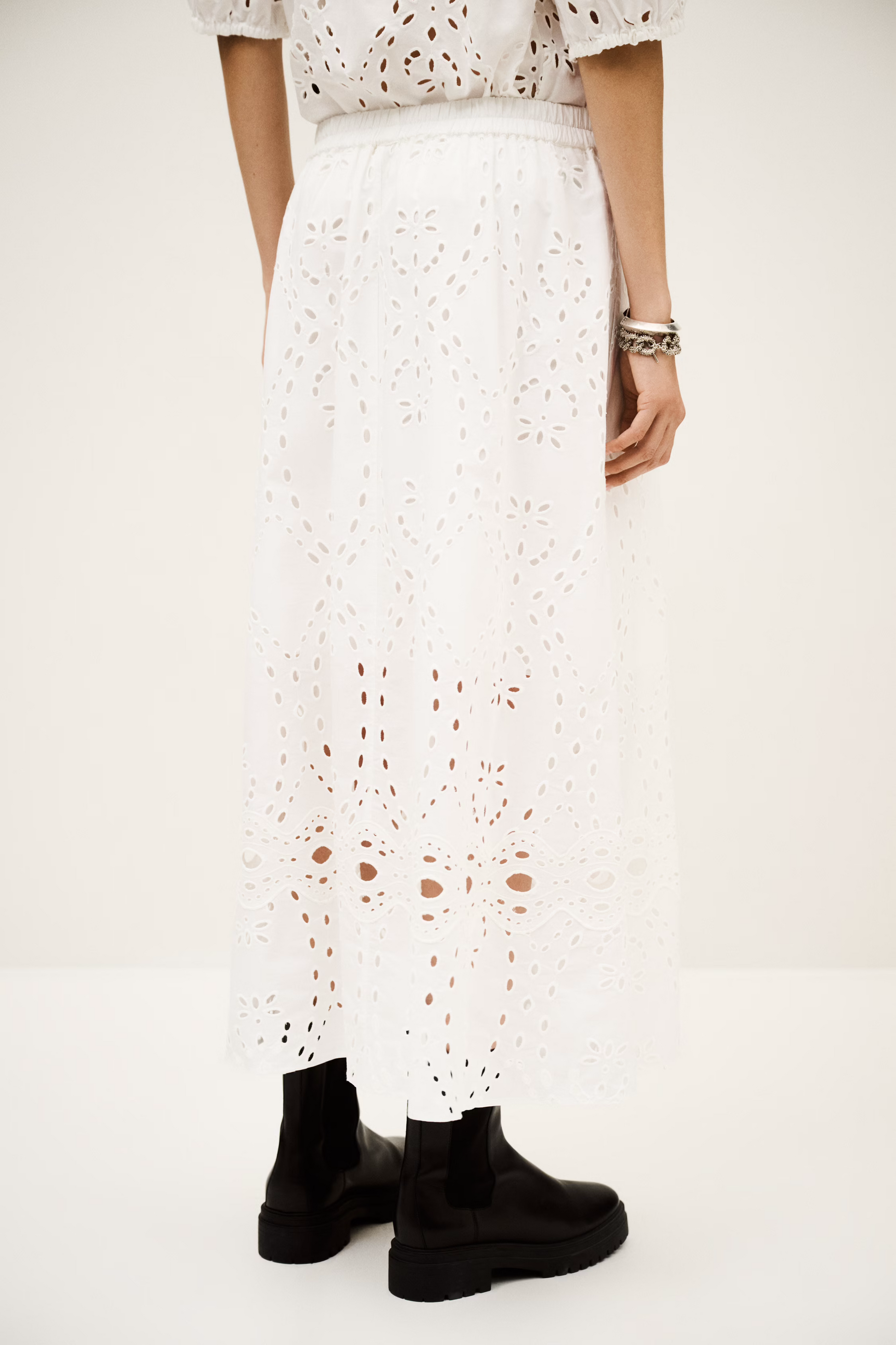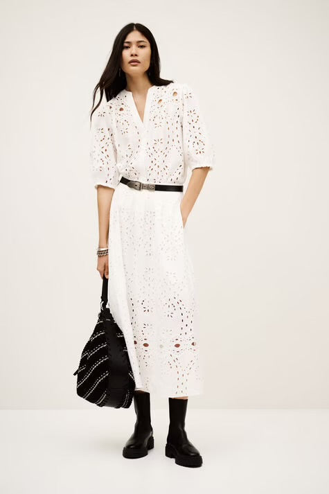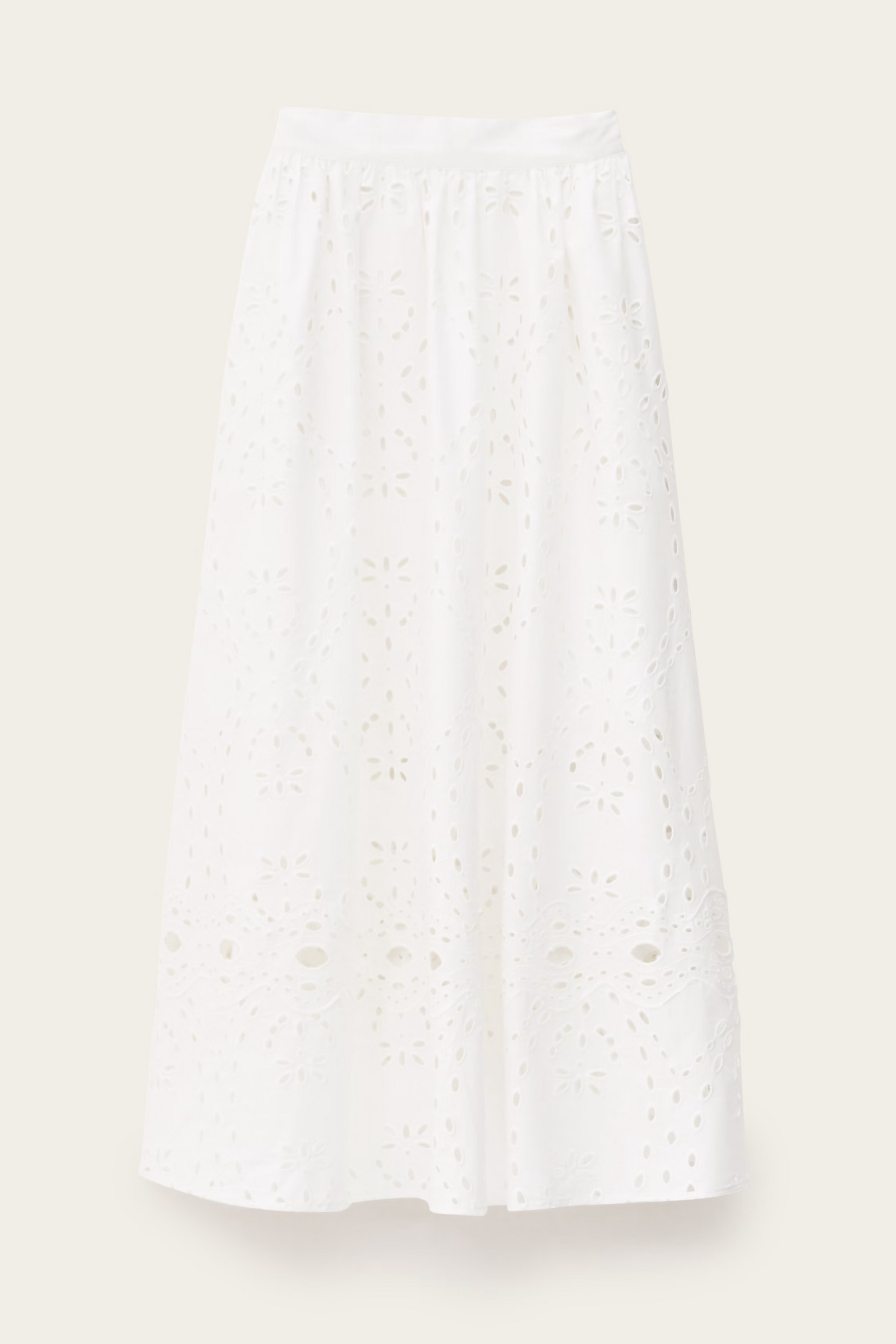 Ilgas, platėjančio A silueto sijonas su angliško siuvinėjimo (broderie anglaise) detalėmis. Elastingas liemuo užtikrina komfortą, o ažūrinės juostos apačioje suteikia lengvumo ir subtilaus dekoratyvumo. Pamušalas garantuoja patogų dėvėjimą ir gražų kritimą. Puikus pasirinkimas tiek kasdieniams, tiek labiau išgrynintiems deriniams.