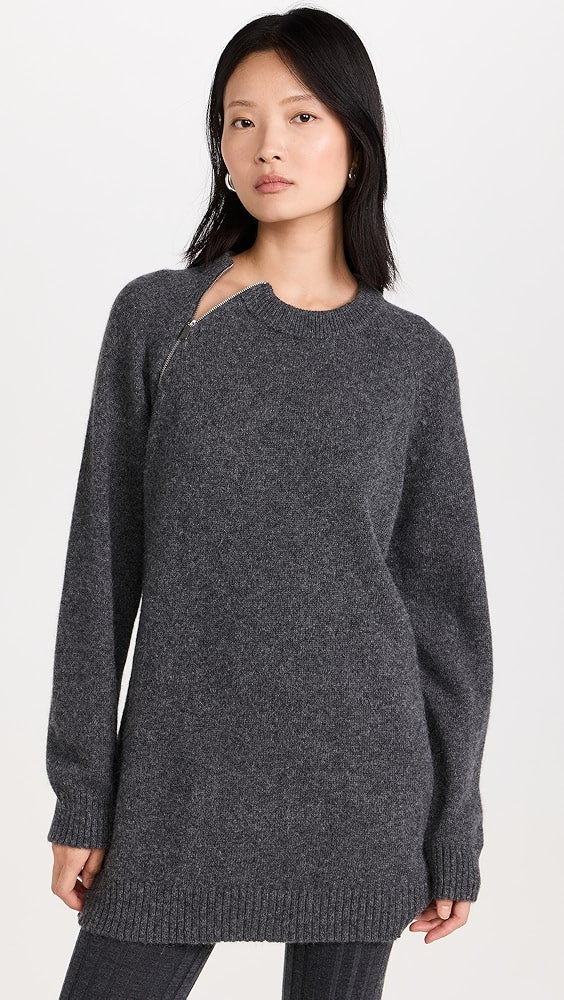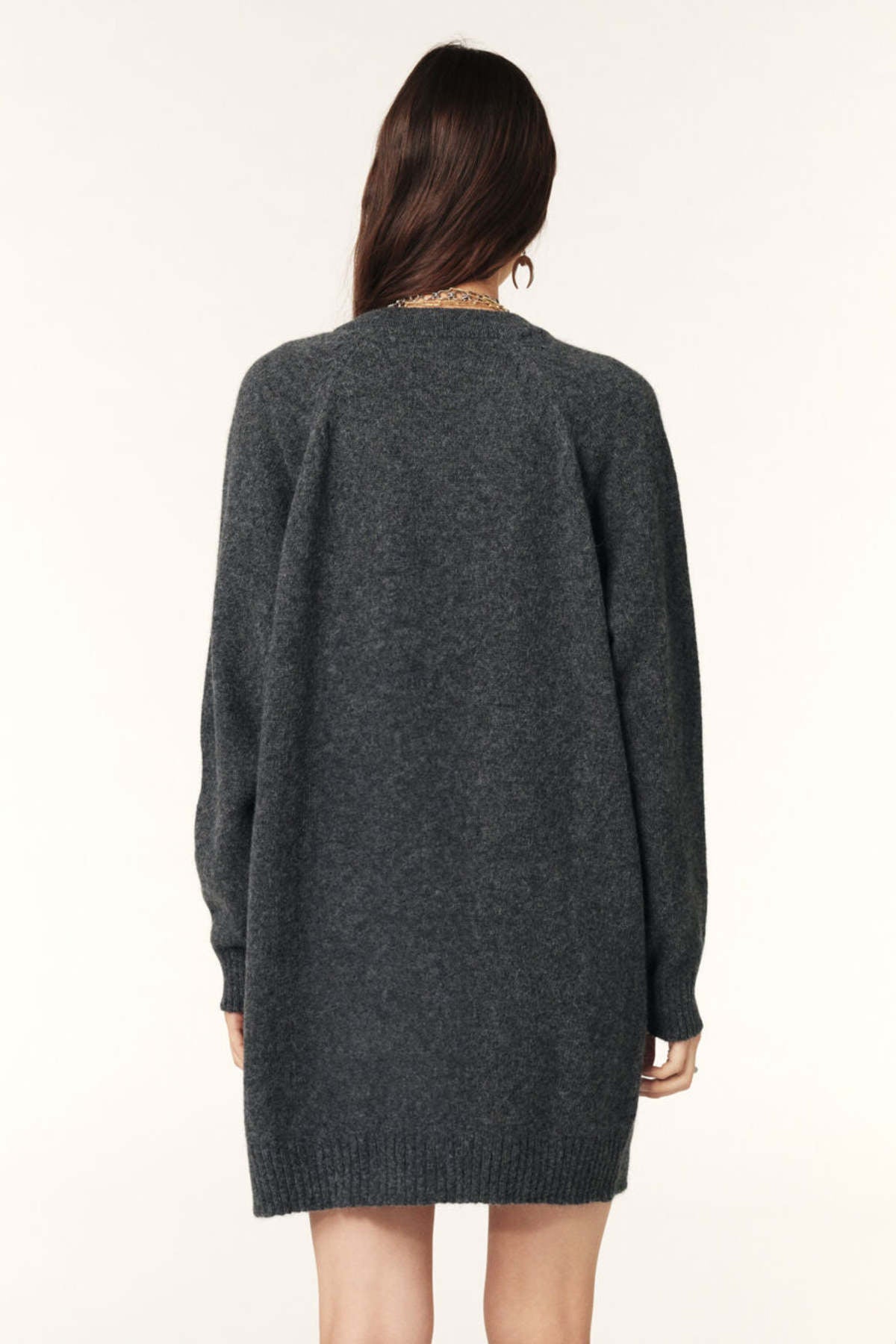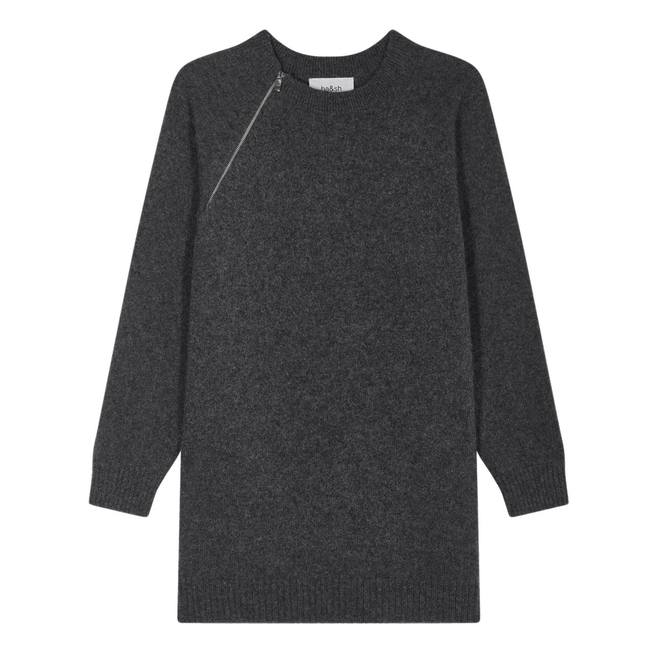 Megzta suknelė su ilgomis reglan tipo rankovėmis ir apvalia iškirpte. Švarų siluetą papildo diskretiškas užsegimas užtrauktuku po ranka bei rumbuoti apdailos kraštai.