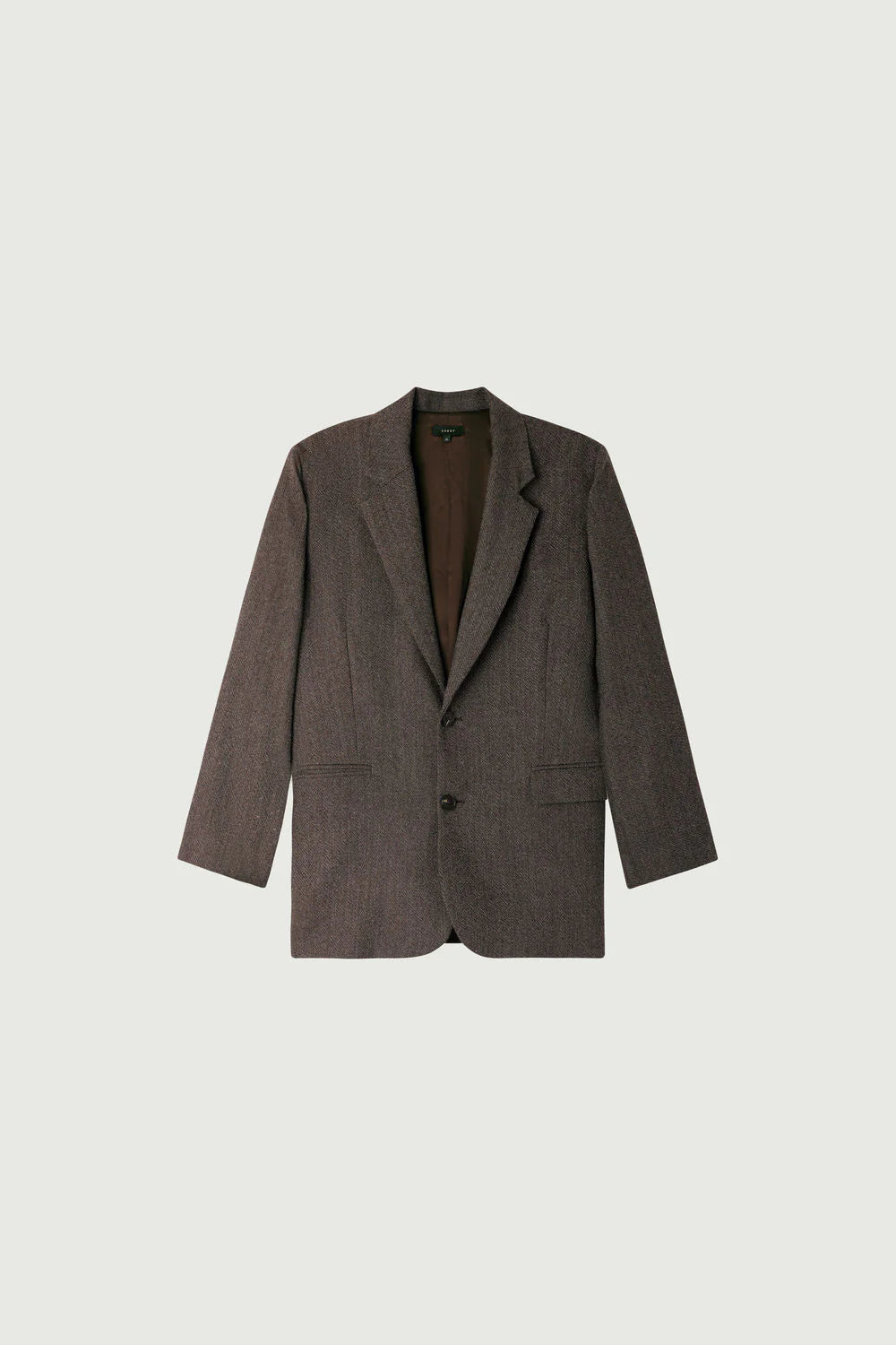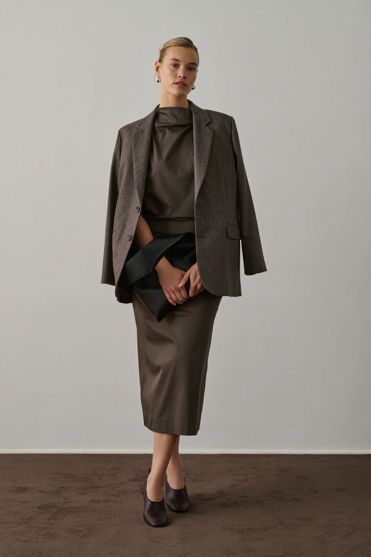 Tiesaus kirpimo švarkas su klasikine kostiumine apykakle. Priekyje – užsegimas sagomis, dvi kišenės su atvartais. Šonuose – skeltukai, suteikiantys daugiau judesio laisvės. Siūta iš vilnonio audinio.