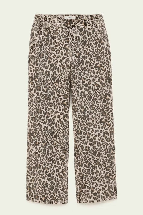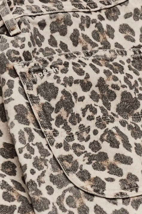 Džinsai su šoninėmis ir galinėmis kišenėmis, išsiskiriančios išblukintu leopardiniu raštu ir 90-ųjų įkvėptu vintažiniu charakteriu. Platėjantis kirpimas suteikia laisvą, madingą siluetą ir leidžia lengvai kurti tiek kasdienius, tiek drąsesnius derinius.