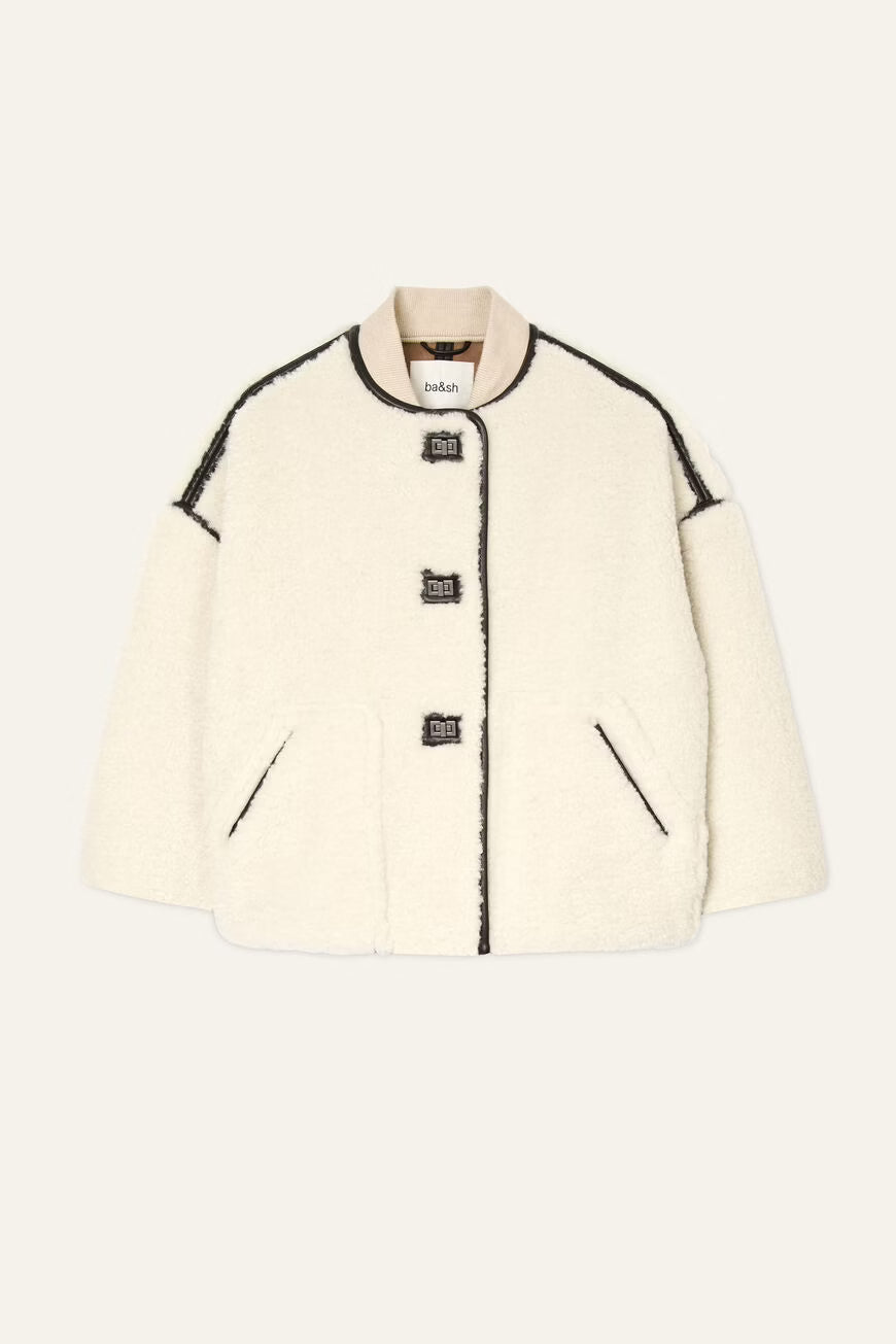 Modelis su ilgomis rankovėmis ir priekiniu užsegimu sagomis bei kvadratinėmis metalinėmis sagtimis. Kišenės su įleistiniu įsiuvu. Kontrastingos juostelės pečiuose, rankovių angose, apačioje, iškirptėje ir per nugaros vidurį suteikia išskirtinumo. Apykaklė su derančios spalvos megzta tampria juostele. Siluetas – laisvas, „oversize“.