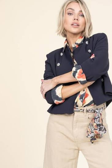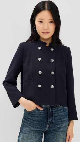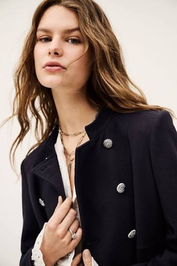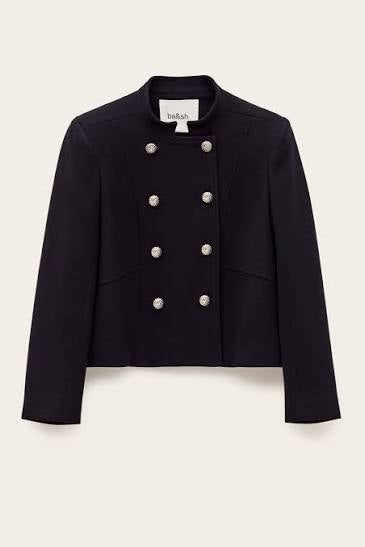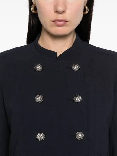 Elegantiškas, struktūruoto silueto švarkas sodrios tamsiai mėlynos („midnight blue“) spalvos. Dvieilis sagų užsegimas ir pečių įdėklai kuria ryškią, modernią liniją, o ilgos rankovės suteikia klasikinių proporcijų. Rafinuotas modelis, puikiai tinkantis tiek prie sijono, tiek prie kelnių ar džinsų – nuo dienos iki vakaro derinių.