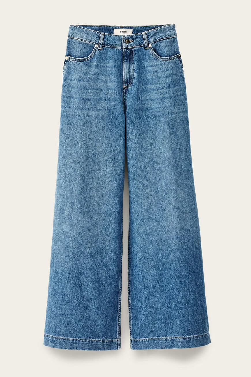 Vidutinio aukščio liemuo, prigludęs ties juosmeniu. Plačios, į apačią platėjančios klešnės, siūtos iš minkšto džinso audinio, suteikiančio patogumo ir laisvo kritimo efektą.