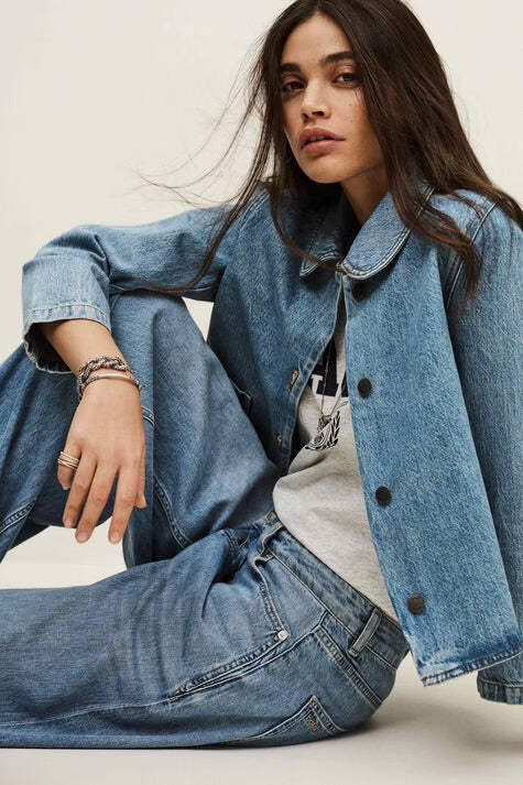 Trumpas džinsinis švarkelis tiesaus kirpimo su trijų ketvirčių rankovėmis ir moteriška Claudine tipo apykakle. Kontrastingos siūlės ir uždėtinė kišenė suteikia modernų, laisvalaikio stiliaus akcentą.