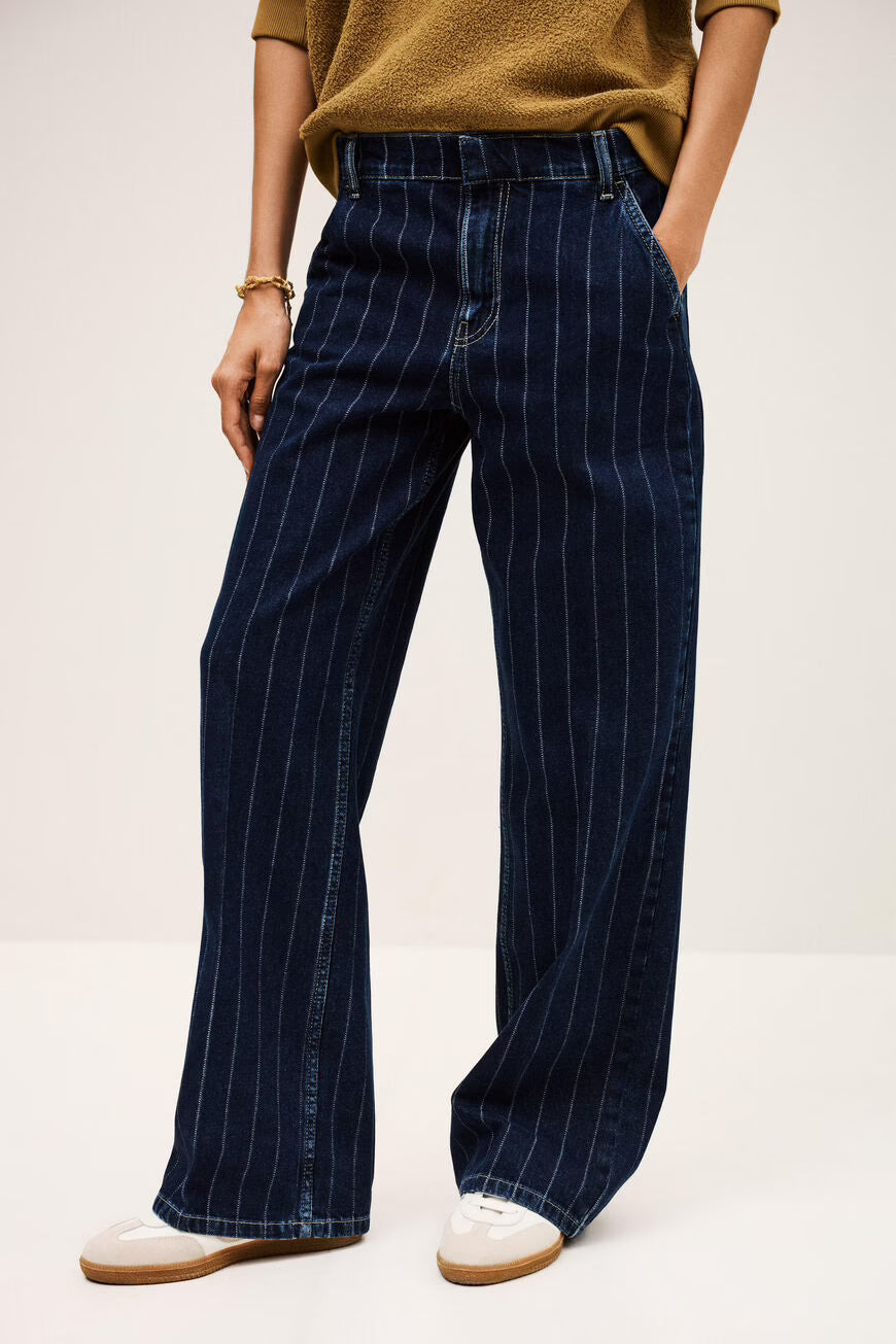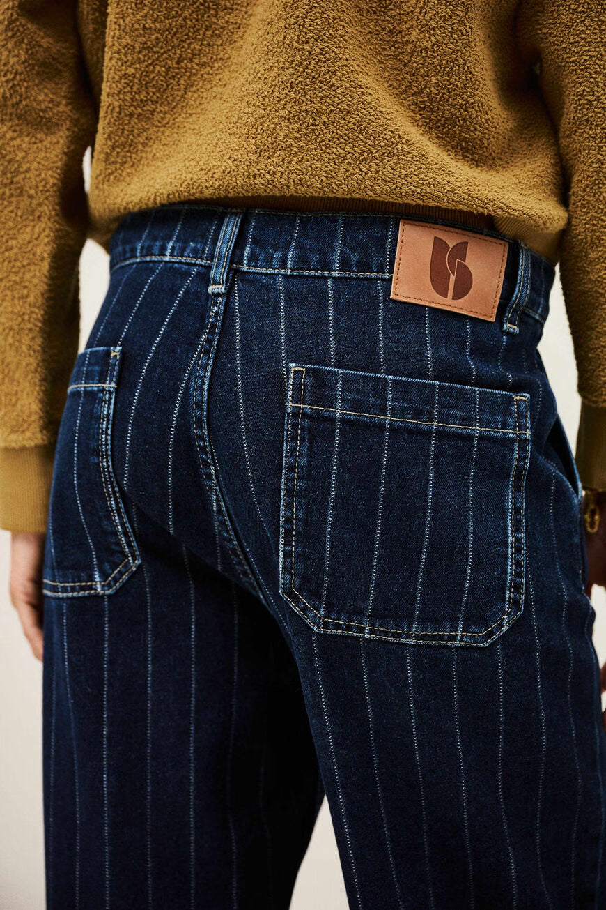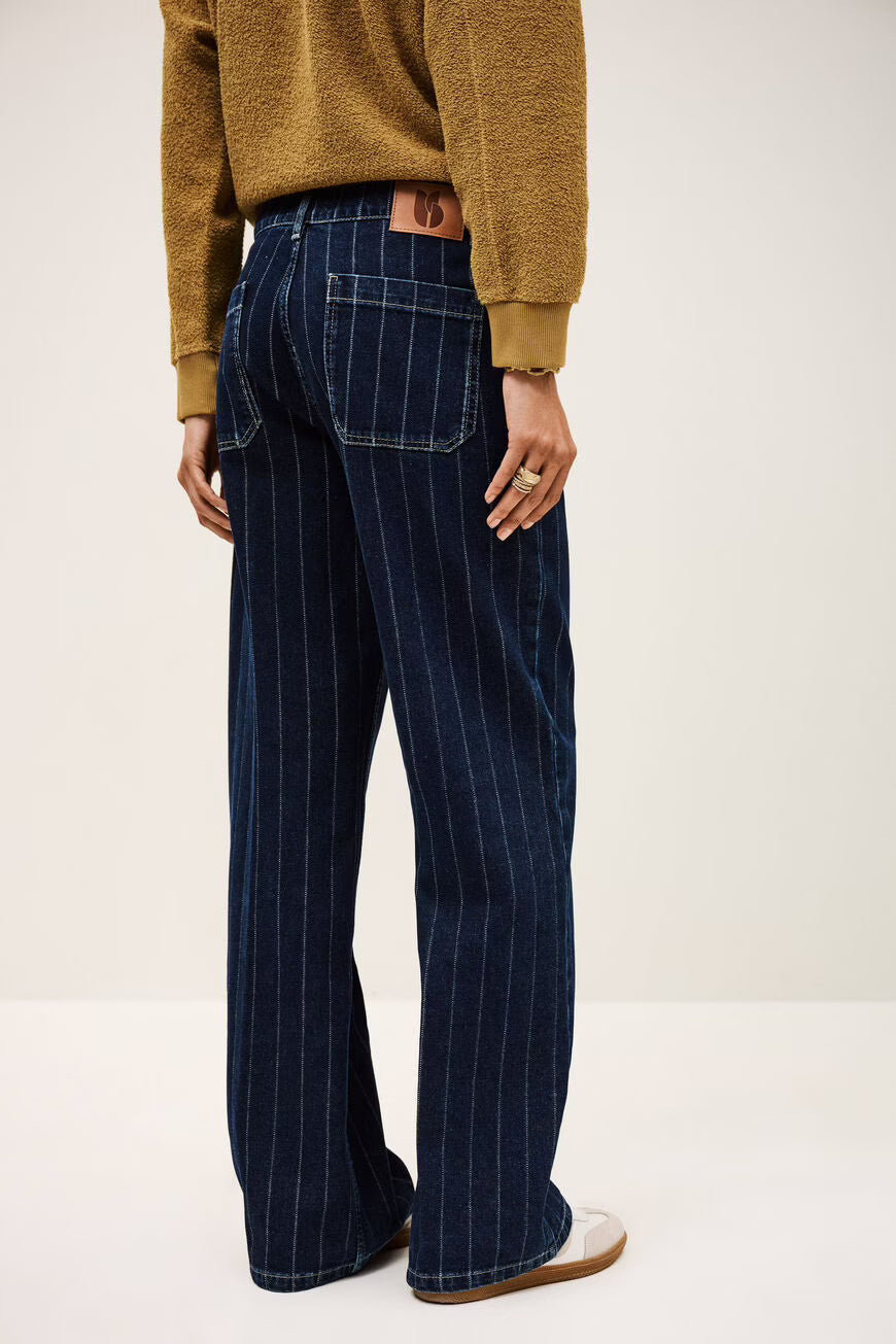 Vyriškų kelnių stiliaus modelis su tiesiomis, platesnėmis klešnėmis ir vidutinio aukščio liemeniu. Priekyje – paslėptas sagų užsegimas. Audinys su balintomis, išlygintomis klostėmis, iš lengvai patrinto mėlyno džinso.