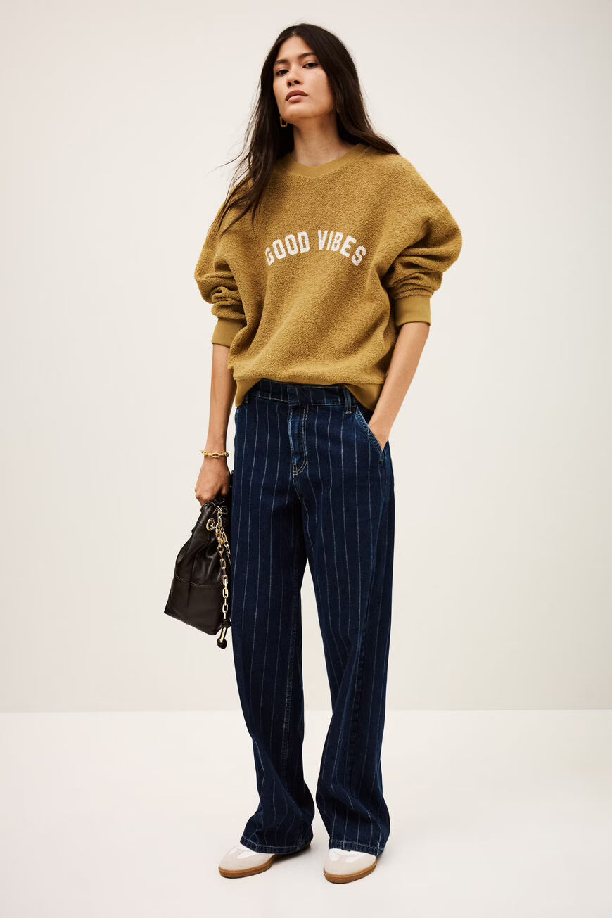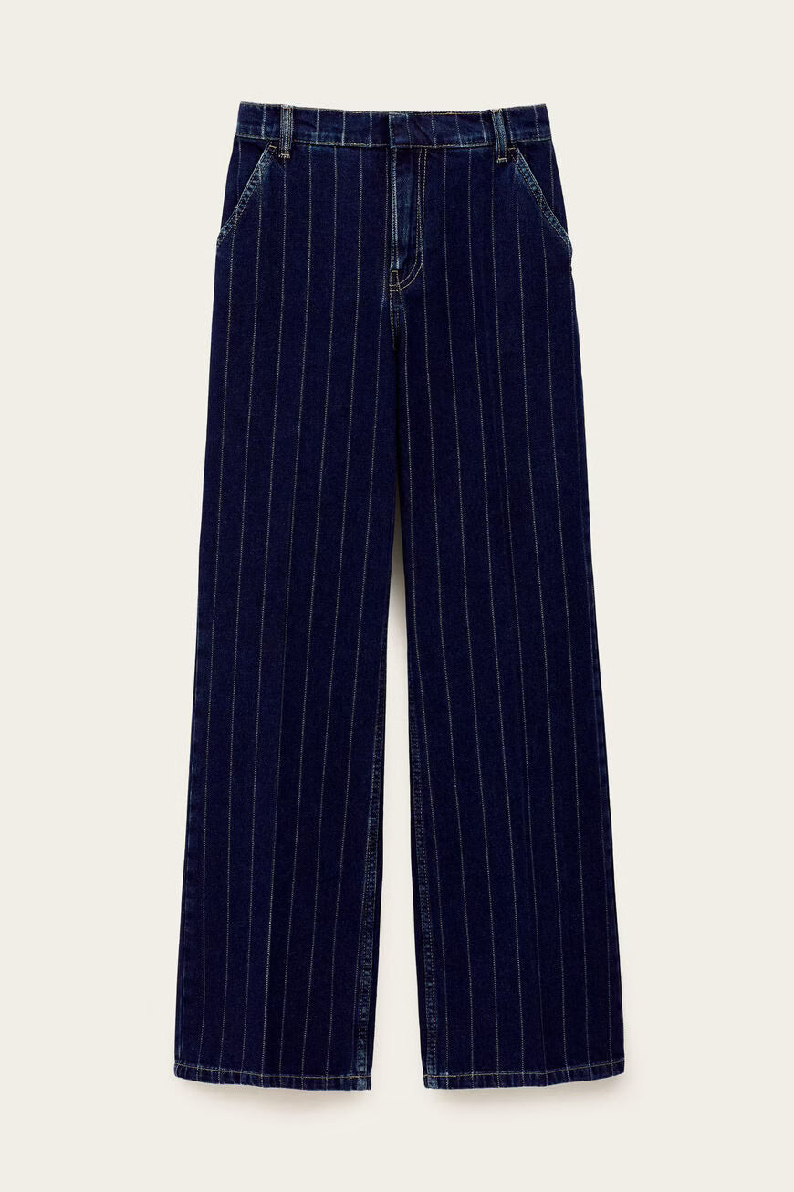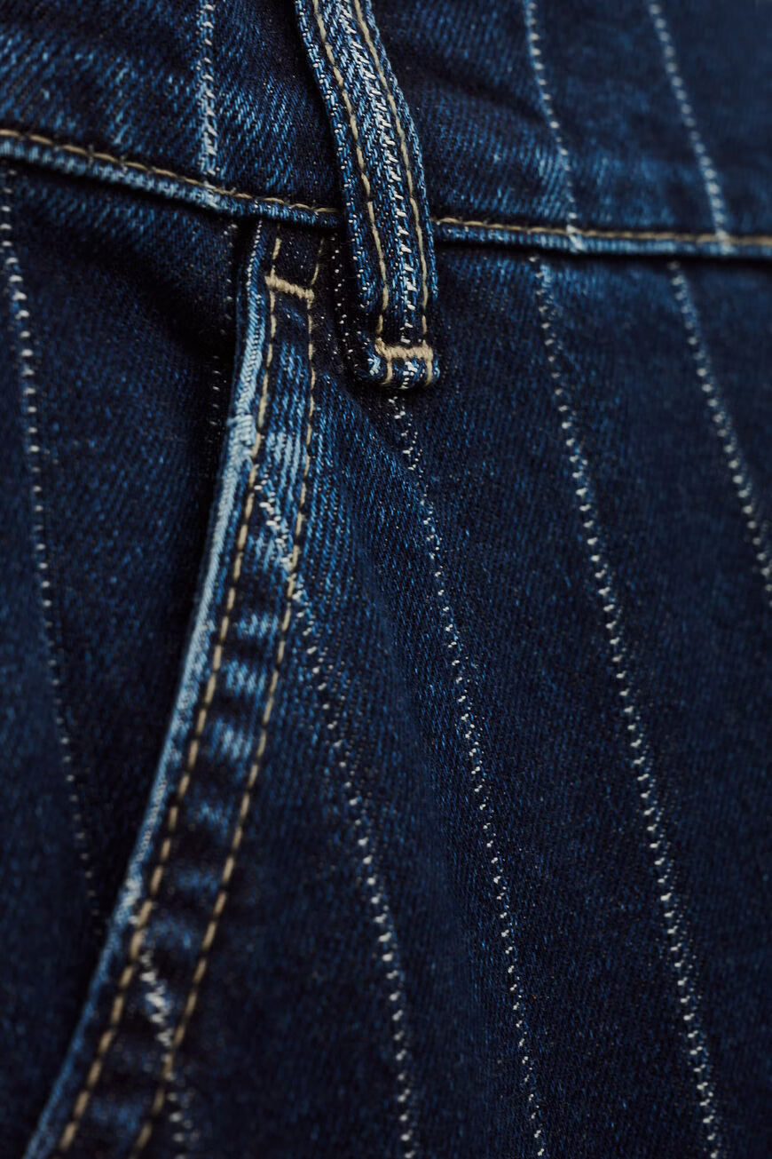 Vyriškų kelnių stiliaus modelis su tiesiomis, platesnėmis klešnėmis ir vidutinio aukščio liemeniu. Priekyje – paslėptas sagų užsegimas. Audinys su balintomis, išlygintomis klostėmis, iš lengvai patrinto mėlyno džinso.